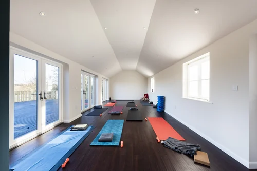 The yoga and meditation studio opens out onto a large balcony overlooking the grounds, creating a calm and spacious environment for practice.